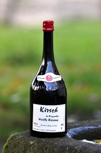 * Très diffèrent du Kirsch d'Alsace ou de Bourgogne, le Kirsch de Fougerolles se distingue par trois points : - La qualité des cerises, ces guignes typiques, aux variétés extrêmement localisées, associées à son terroir (sol-climat) - La distillation "sans repasse", en une seule fois, contrairement à l'Alsace qui distille deux fois l'eau de vie - Le titre alcoolique de 50° minimum pour le Kirsch fermier, contre 45° pour le Kirsch des distillateurs.