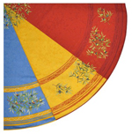 Nappe en tissu provençal, à petits motifs multiples. Vaisselle unie, sans motifs, blanche, écrue, ou correspondant à la couleur dominante (jaune, rouge ou bleu intense). Accessoires et mortier en bois d'olivier clair. Couverts à manche blanc ou en bois clair.