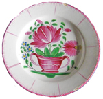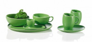 Nappe claire au décor discret (rayures, fleurs, broderies...) ton sur ton ou pastel. Vaisselle, qui tient la vedette, en faïence vernissée unie, vert foncé ou rouge foncé, à décor sculpté.