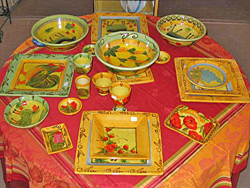 Nappe en toile jaune clair Vaisselle en faïence de Moustiers (ou imitation), généralement à dominante bleue ou bleu et jaune. Accessoires (dessous de plat, couverts de service, et mortier (pour l'Aïoli) en bois d'olivier clair.