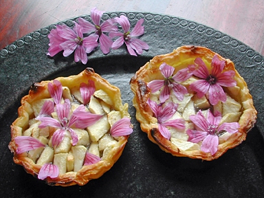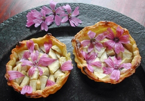 - Etaler le confit de mauves et recouvrir de pommes détaillées en lamelles.