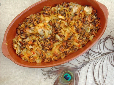 - Mélanger la préparation de moules et d’oignons à la sauce et laisser cuire encore 5 minutes à petit feu.