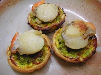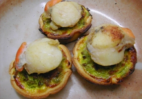 - Poêler les noix de St Jacques dans le beurre pendant 2 minutes sur chaque face, saler légèrement et placer une noix sur le sommet de chaque tartelette avant de servir.