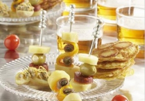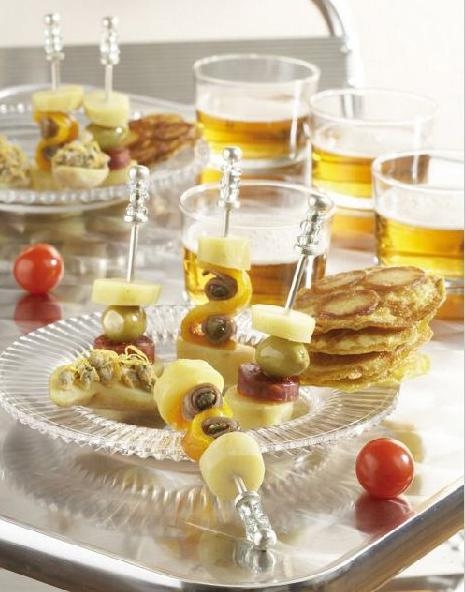 - Montez sur une pique en bois, une rondelle de Ratte du Touquet puis une rondelle de chorizo, une olive farcie aux amandes.