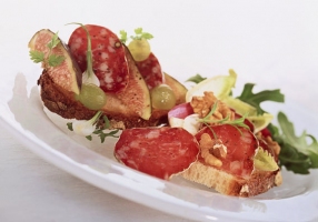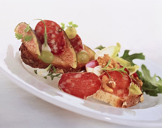 - Déposer sur les tartines une petite feuille de roquette et d’endive, les tranches de saucisse sèche, les cerneaux de noix, les figues coupées en quatre et quelques grains de raisin.