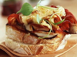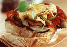 - Déposer un peu de roquette, le jambon en chiffonnade, la tomate confite et le Rocamadour.