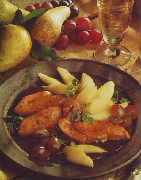 - Verser délicatement la sauce aux raisins sur le foie gras et les fruits.