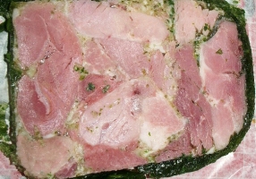 - Dans une terrine ou un grand saladier, mettez une couche de persil ciselé, puis une couche de jambon écrasé. Continuez en alternant les couches.
