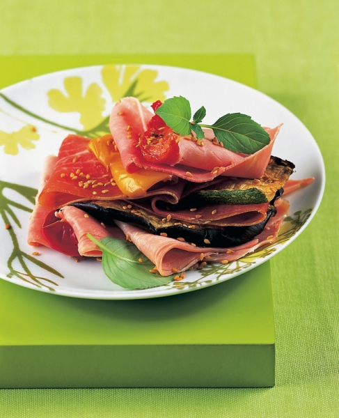 - Préparez les mille-feuilles en disposant successivement une tranche de jambon blanc, une tranche d'aubergine grillée, une tranche de jambon cru, deux lamelles de courgette, une tranche de poivron puis terminez par une tranche de jambon blanc et une tomate confite.