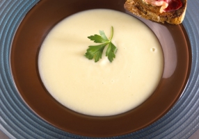 - Placer les quartiers d'artichauts au fond de 4 assiettes creuses, y verser le potage
