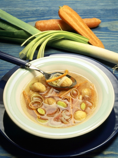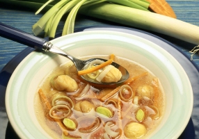 - Découper les carottes en fins bâtonnets et les poireaux en fines rondelles.