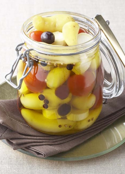 - Dans un bocal, disposez en alternance les Fine de Ratte du Touquet, les tomates cerise, le chèvre et les olives.