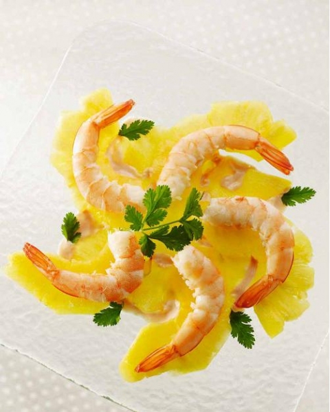 - Alterner crevettes et ananas et accompagner de la sauce.