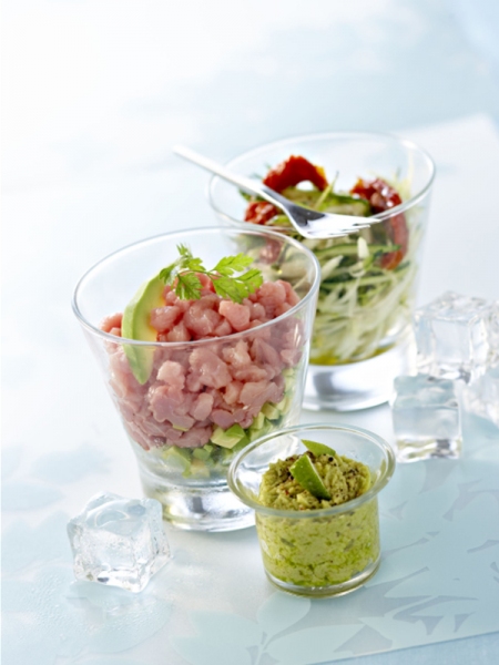 - Dans les verres de présentation répartissez l'avocat puis les courgettes, versez la sauce aux deux huiles, ajoutez la viande, versez un filet d'huile d'olive et décorez avec les pétales de tomates confites.
