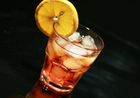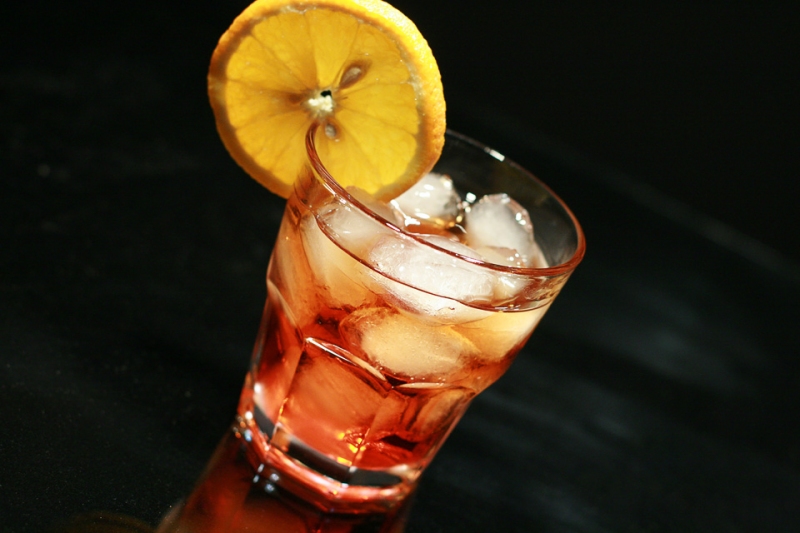 - Mettre le tout dans un verre apéritif sur de la glace pilée. - Décorer avec une demi-tranche d'orange.