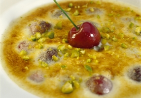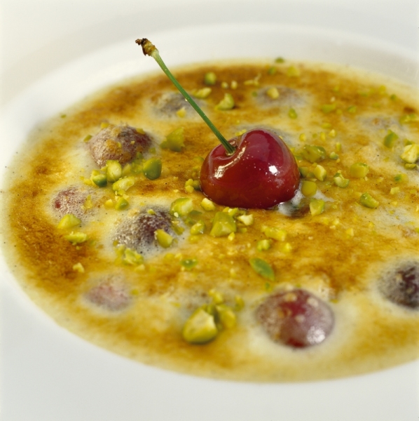 - Dans un plat à gratin, déposer une couche de biscuits concassées, déposer les cerises égouttées et couvrir de crème légère, parsemer de pistaches.