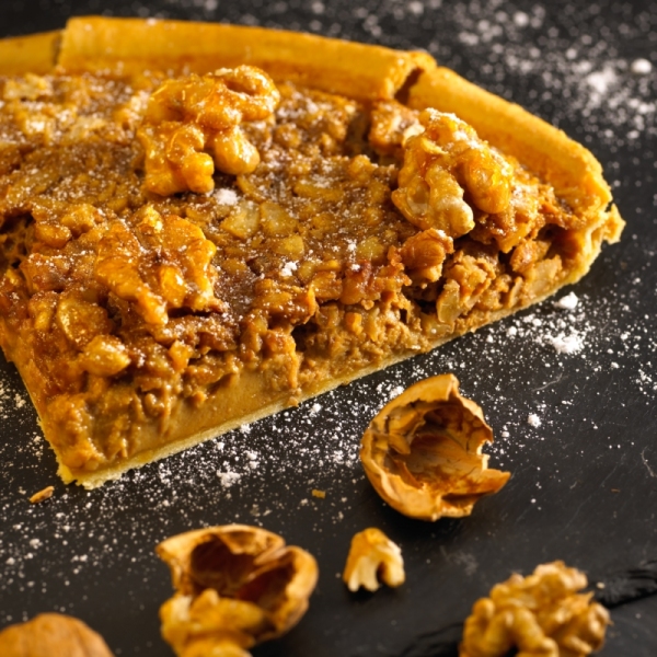 - Saupoudrer la tarte de sucre glace, décorer avec les cerneaux de noix.