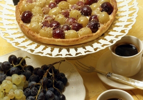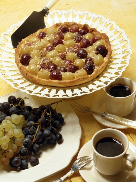 - Verser sur les raisins en prenant garde que le pralin soit bien réparti sur la tarte.