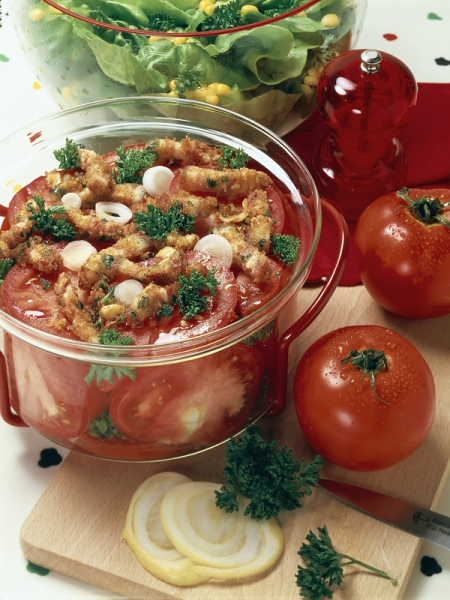 - Alterner rangs de tomates et de farce qui restera en couche supérieure.
