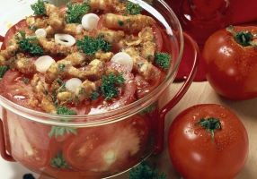 Servez un vin blanc, rosé ou rouge tout en vivacité et léger fruité : la vivacité du vin se trouvera à l’aise avec l’acidité de la tomate qui laissera libre cours à une saveur fruitée. Les aromates embaumeront le vin. La finale se fera toute explosive. Allez chercher le vin dans la France Septentrionale.