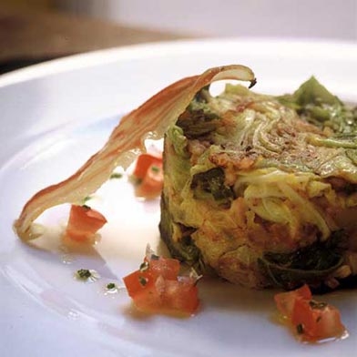 - Présenter le trinxat en timbale en posant la tranche de ventrèche grillée.