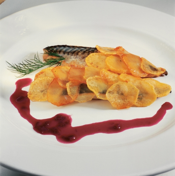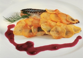 - Sur assiette, placer un filet de maquereau, le recouvrir de pommes de terre sautées disposées en écailles.