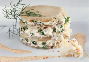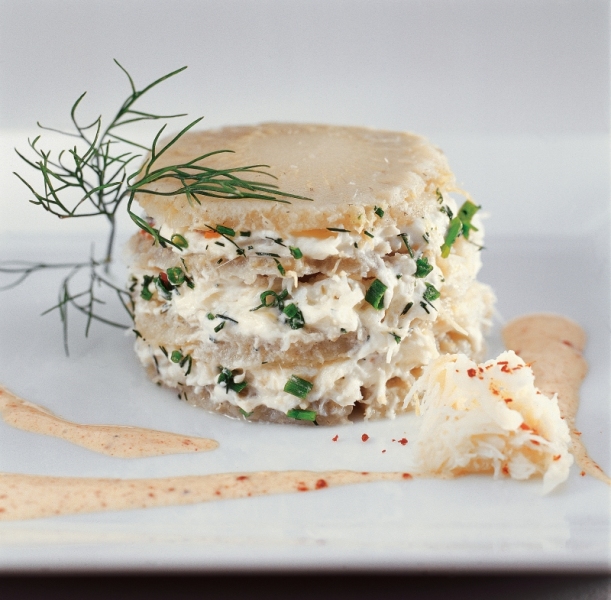 - Dans 4 assiettes, placer un cercle d'artichaut, couvrir d'une couche du contenu du saladier, disposer un autre cercle d'artichaut et renouveler l'opération jusqu'à épuisement des ingrédients (en terminant par un cercle d'artichaut).