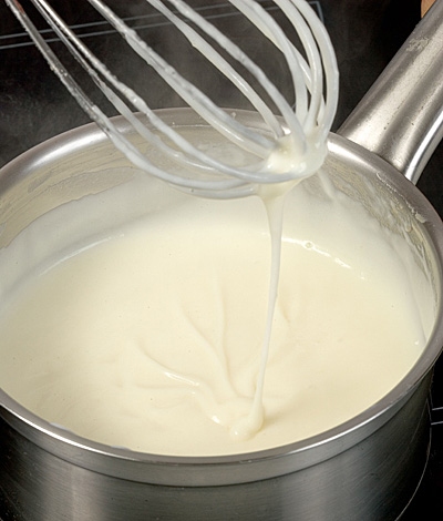 – Dans une autre casserole, porter le lait à ébullition. Le verser progressivement sur le roux blanc refroidi. Mélanger à l’aide d’un fouet. Porter à ébullition 5 minutes environ tout en mélangeant. Assaisonner. La sauce doit épaissir progressivement, elle devient onctueuse et nappante.