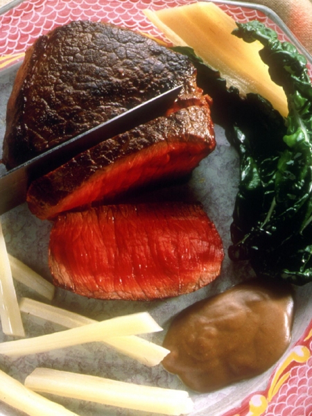 - Couper la viande en quatre puis en lamelles épaisses et la répartir dans quatre assiettes chaudes.