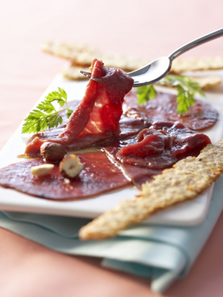 Servez le carpaccio accompagné des croustilles de noisettes.