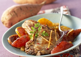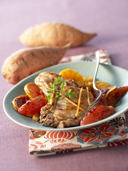 Servez les côtes de porc accompagnées des pamplemousses caramélisés et des patates douces écrasées en purée.