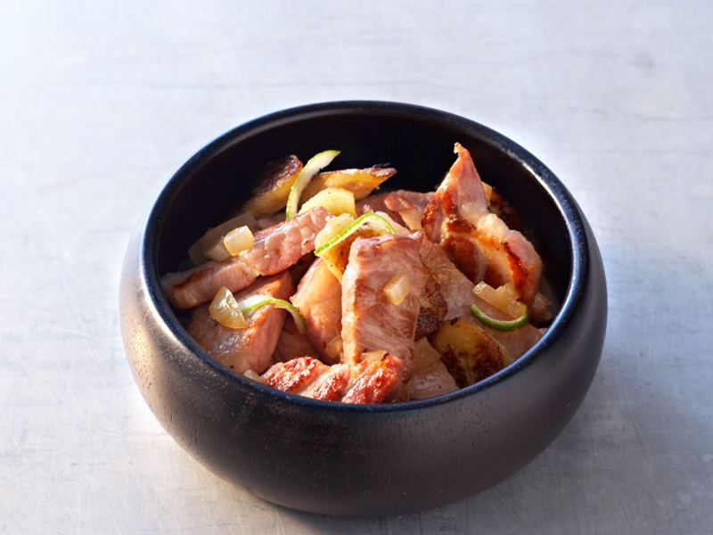 Servir le duo d'échine et de lardons accompagné d'un riz blanc.