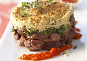 - Etalez les joues de porc effilochées dans un plat à gratin, recouvrez de la pâte à crumble et mettez 30 minutes au four.