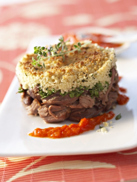 Servez le crumble de joues de porc accompagné d'une mousse ou d'un coulis de tomates fraîches.
