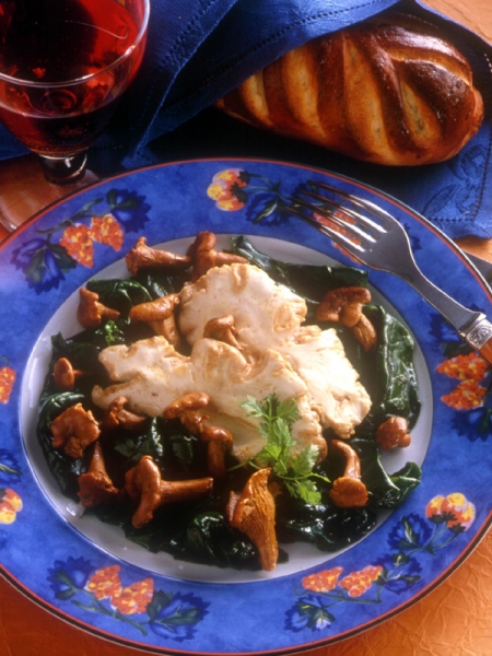 Tout serait en douceur s’il n’y avait dans le mets la présence de l’épinard et de la girolle. Pour déjouer vos sensations gustatives, osez servir un vin blanc sec de cépage Muscat – Il se présente en général finement aromatisé au nez et ample en bouche – Le mets va s’en trouver enrobé, l’amertume de l’épinard disparaît et les girolles se font moins sauvages. Belle finale muscatée !