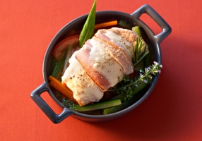 - Entre chaque tranche de viande, intercaler une tranche de mozzarella et une tranche de poitrine de porc puis ficeler le tout pour lui donner la forme d'un rôti.