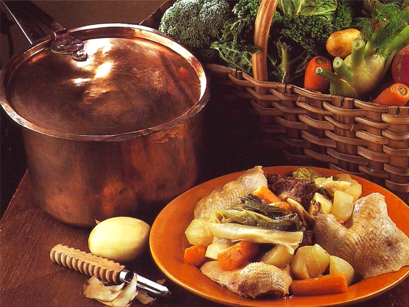 - Mettre la poule vidée, le plat de côte et le morceau de jambon dans une grande marmite avec les poireaux, les carottes, les navets, les oignons piqués de clous de girofle et le céleri (les légumes doivent rester entiers pour supporter la cuisson longue).