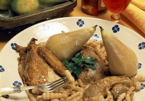 - Peler les poires en conservant la queue et les placer entières, à mi-cuisson, autour de la pintade.