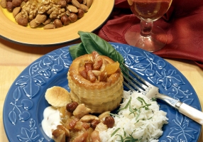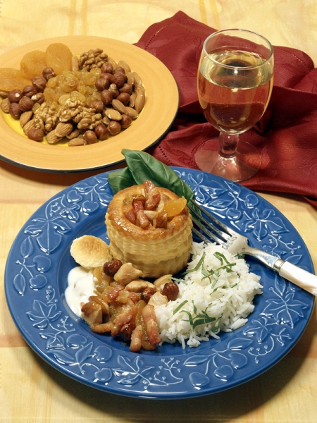- Pendant la cuisson du poulet et des fruits secs, faire chauffer les vols-au-vents au four (Th. 6).