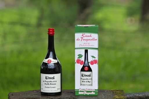 * Très diffèrent du Kirsch d'Alsace ou de Bourgogne, le Kirsch de Fougerolles se distingue par trois points : - La qualité des cerises, ces guignes typiques, aux variétés extrêmement localisées, associées à son terroir (sol-climat) - La distillation "sans repasse", en une seule fois, contrairement à l'Alsace qui distille deux fois l'eau de vie - Le titre alcoolique de 50° minimum pour le Kirsch fermier, contre 45° pour le Kirsch des distillateurs.