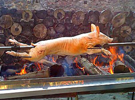 * Puis en vedette, viennent les viandes, rôties ou grillées, soit à la broche, ou façon méchoui, soit tout simplement au barbecue (cachez-le s'il est électrique..). Selon les possibilités et le nombre de convives, ce sera un cochon de lait, un agneau, un chevreau ou un petit mouton (entiers ou en côtelettes..) : Cochon de lait rôti - Cabri rôti - Carré d'agneau au thym et ses artichauts - Gigot Brayaude - Gigot d'agneau à la carotte et au foin - Gigot de mouton de Barrèges Gavarnie - Cari de mouton - Chevreau à l'ail vert