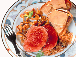* Le Relevé gourmand consacré au foie gras, et les Entrées, bouchée à la reine et canard aux légumes. Foie gras au torchon, Foie gras sur pain d'épices, Canard à la Duchambais, Canard de Challans aux navets, Vol au vent de volaille aux fruits secs, Tarte fine aux poires et au Bleu d'Auvergne, Beignets de courges