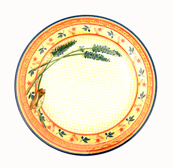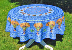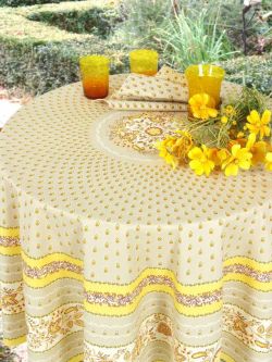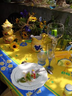 Nappe en toile jaune clair Vaisselle en faïence de Moustiers (ou imitation), généralement à dominante bleue ou bleu et jaune. Accessoires (dessous de plat, couverts de service, et mortier (pour l'Aïoli) en bois d'olivier clair.