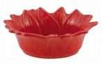 Sets de table tons sur tons ou rouge foncé. Vaisselle en faïence fleurie à dominante rouge-rose. Pour l'Aïoli, un saladier assorti, ou uni rouge, un mortier en marbre ou en bois sombre.