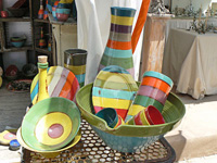 Nappe claire au décor discret (rayures, fleurs, broderies...) ton sur ton ou pastel. Vaisselle, qui tient la vedette, en faïence vernissée unie, vert foncé ou rouge foncé, à décor sculpté.