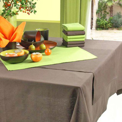Nappe châtaigne, ou beige clair, vaisselle vert pâle et accessoires de table (dessous de plat, couverts à salade...) et mortier en bois clair (frêne, olivier...).
