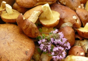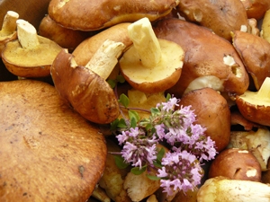 - Jeter les champignons détaillés en morceaux grossiers dans l’huile chaude mais non fumante, ajouter le serpolet ou le thym, saler, poivrer.