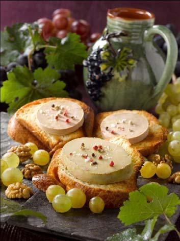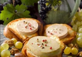 - Couper le foie gras, en déposer une tranche sur les parts de brioche et parsemer avec la fleur de sel, un peu de noix pilées, et du poivre rose concassé.