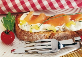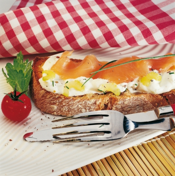 - Etaler la crème de céleri sur le côté non grillé et placer les tranches de truite fumée.