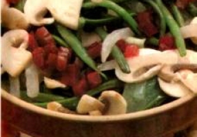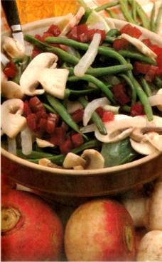 - Dans le saladier contenant la vinaigrette, placer les haricots verts, les champignons et la betterave rouge.